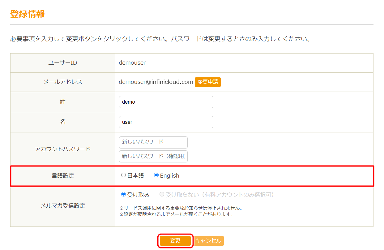 - アカウントの言語が設定されている状態で、設定中の言語でないページ(例:日本語を設定している場合は英語版のページ)にアクセスした場合は、アカウントに設定されている言語のInfiniCLOUDトップページにリダイレクトされます。ただし、非ログイン時および言語設定が未登録の場合はリダイレクトされません。